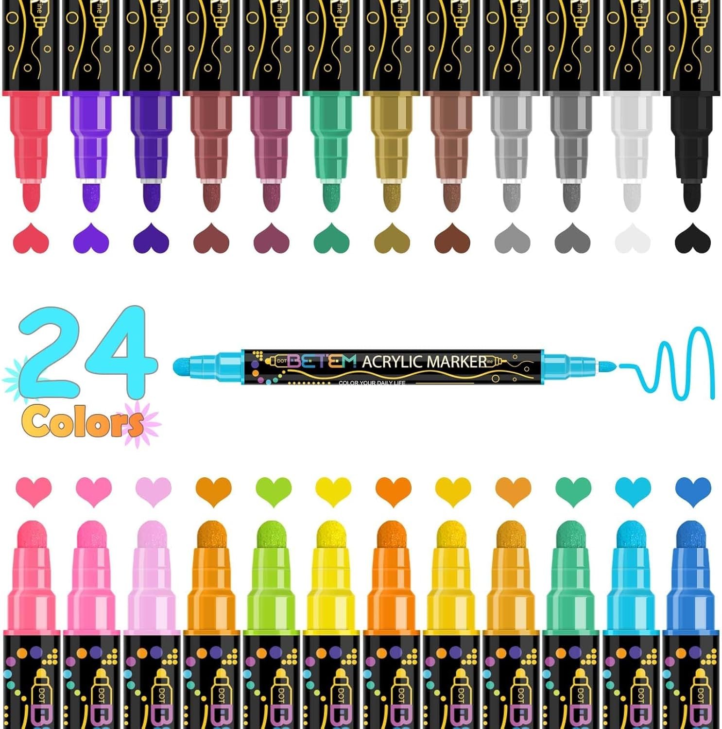 Betem 24 Colors Dual Tip Acrylic Paint Pens Markers, Premium Water-Based Acrylic Paint Markers for Fabric, Rock, Wood, Glass, Paper, Canvas, Ceramic, Fabric Paint Markers DIY Crafts Art Supplies Kit